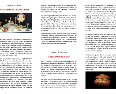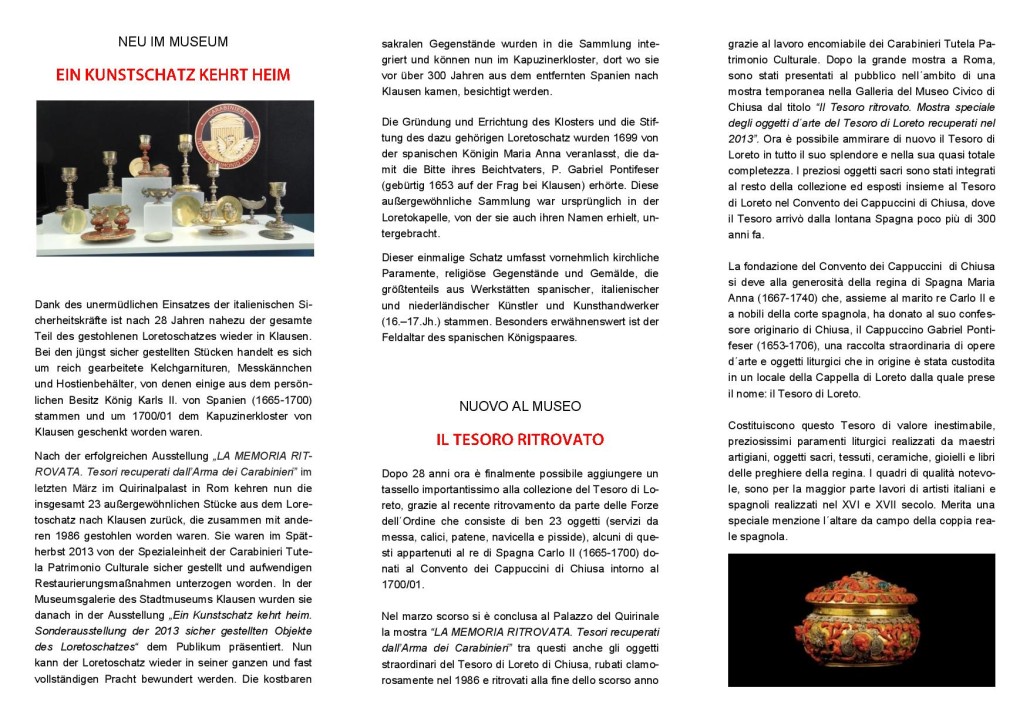 Nel marzo scorso si è conclusa al Palazzo del Quirinale la mostra “LA MEMORIA RITROVATA. Tesori recuperati dall’Arma dei Carabinieri” tra questi anche gli oggetti straordinari del Tesoro di Loreto di Chiusa, rubati clamorosamente nel 1986 e ritrovati alla fine dello scorso anno grazie al lavoro encomiabile dei Carabinieri Tutela Patrimonio Culturale. Dopo la grande mostra a Roma, sono stati presentati al pubblico nell´ambito di una mostra temporanea nella Galleria del Museo Civico di Chiusa dal titolo “Il Tesoro ritrovato. Mostra speciale degli oggetti d´arte del Tesoro di Loreto recuperati nel 2013”. Ora è possibile ammirare di nuovo il Tesoro di Loreto in tutto il suo splendore e nella sua quasi totale completezza. I preziosi oggetti sacri sono stati integrati al resto della collezione ed esposti insieme al Tesoro di Loreto nel Convento dei Cappuccini di Chiusa, dove il Tesoro arrivò dalla lontana Spagna poco più di 300 anni fa.