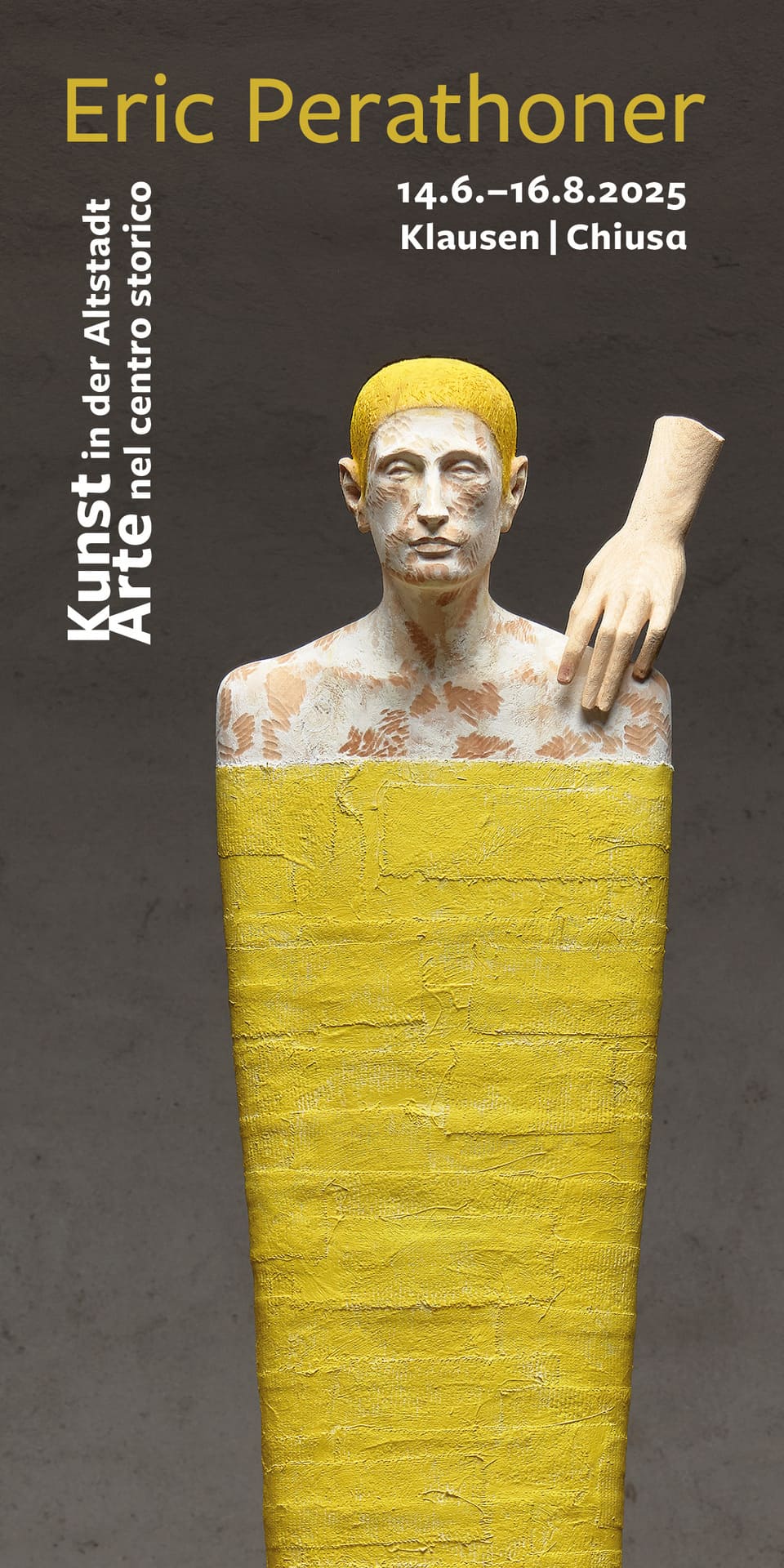 A dieci anni di distanza dalla mostra al Museo Civico di Chiusa Eric Perathoner, con questa mostra d’arte diffusa, offre una vasta panoramica della sua produzione artistica nell’ambito del progetto “Arte nel centro storico” in ben 33 postazioni dislocate nel centro storico di Chiusa.